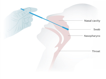 A nasopharyngeal swab is a soft-tipped stick with bristles at the end that is inserted into the back of the nasal cavity and rotated to collect mucus samples. The swabs are then placed into vials containing transport media. 3D-printed NP swabs are designed with a break point 7–8 cm from the tip to retain the sample end and fit securely into the vial for transport to the testing lab.